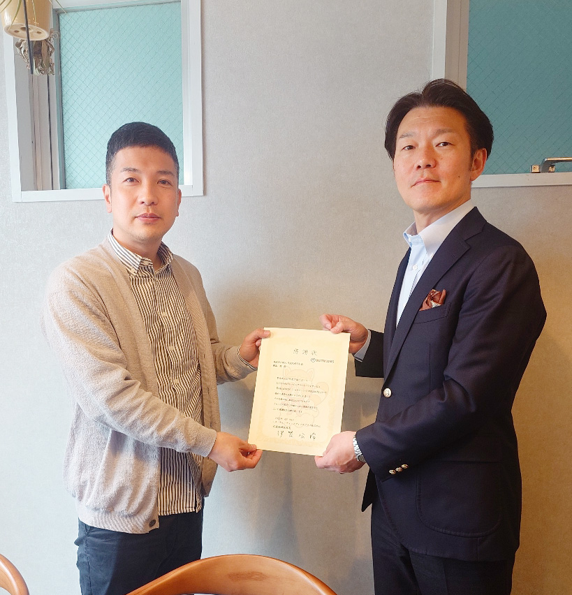大きく貢献いただきました株式会社縁人(東京都板橋区、代表取締役社長 横山 満)様に感謝の意を表し感謝状をお渡ししました。