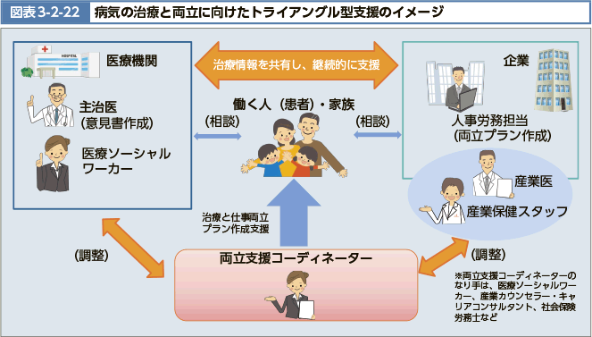 がん・難病などの疾患ごとの治療方法や症状の特徴など企業が理解しやすいための疾患別サポートマニュアルを作成し、医療機関と企業が連携して治療情報を共有し職場かつ業務時間中でも安心して治療に取り組める体制づくりに力を入れています。