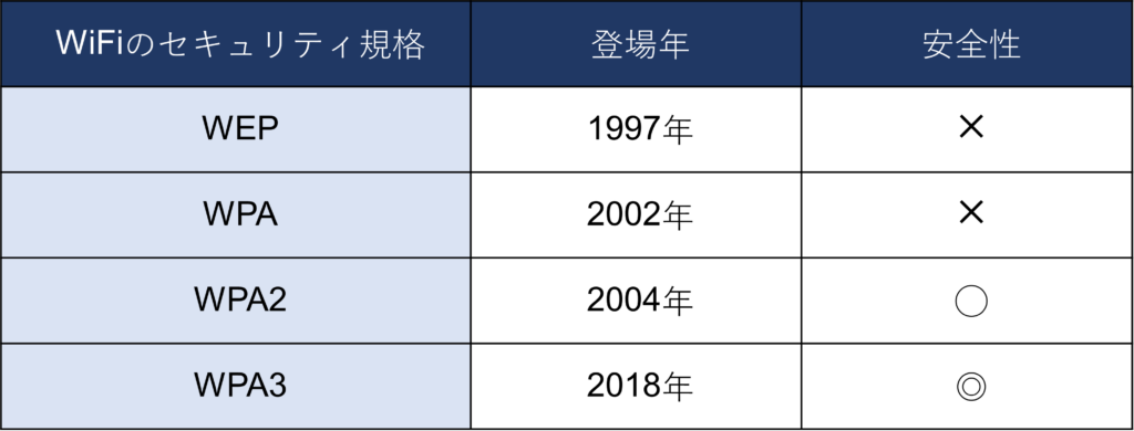 無線LANのセキュリティ規格には以下の4種類がありますが、現在推奨されているのは「WPA2」と「WPA3」の2つです。