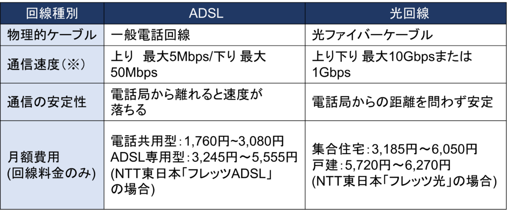 通信速度はADSLが最大でも50Mbpsとなっていますが、光回線は1Gbps~10Gbpsとなっています。速度は圧倒的に光回線の方が速く、ストレスなく利用できます。