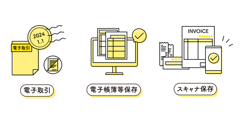 これらのうち、「電子取引データ保存」が2024年1月から義務化され、電子データで受け取った書類は原則、電子のまま保存することが求められます。
