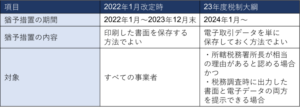 ただ猶予期間が設けられたため、2023年12月31日までは「印刷して保存」による対応で問題ありません。23年度税制大綱では、2024年1月から適用できる新たな猶予措置が設けられました。