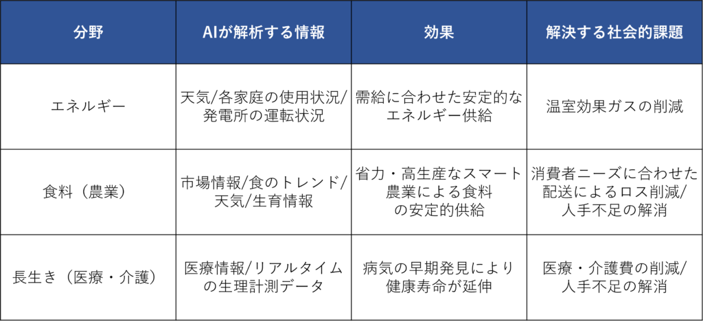3つの分野について、AIが解析する情報とその効果、解決する社会的課題をまとめました。