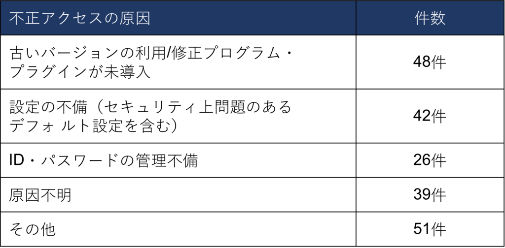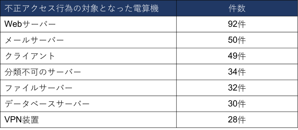 Webサーバーの被害件数は、2位のメールサーバーの約2倍であり、突出しています。自社内のオンプレミス環境だけでなく、レンタルサーバーに設置されたWebサーバーも被害に遭っています。各企業は、Webサーバーのセキュリティ対策を見直す必要があるといえるでしょう。
