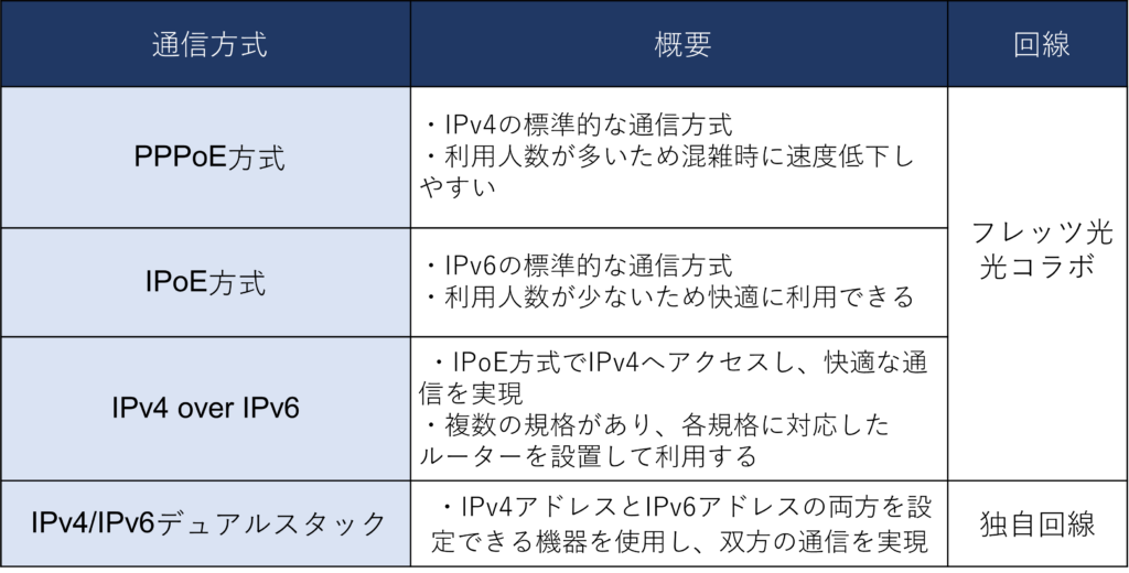 フレッツ光や光コラボの場合は3種類の通信方式があり、概要を把握しておくとスムーズに利用できます。