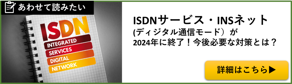 音声とデータの両方をデジタル形式の電気信号にして流す仕組みで、伝送速度は64kbpsです。ISDN回線のデータ通信サービスは2024年に提供終了予定です。