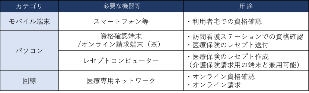 訪問看護におけるオンライン資格確認とオンライン請求導入のために必要な機器は、次のとおりです。