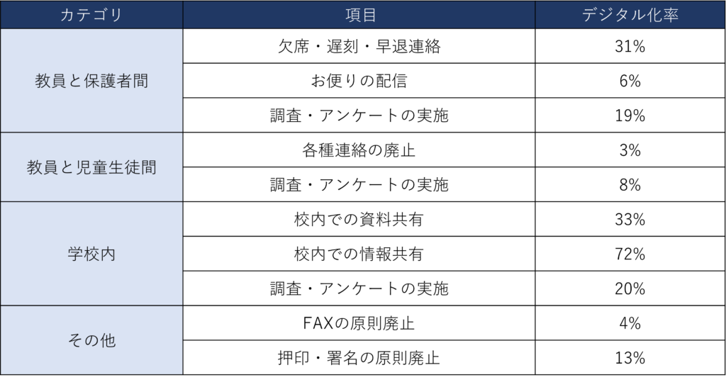 また、校務の中でも、教職員と保護者、児童生徒間の連絡においては、デジタル化が進んでおらず依然として紙や電話でのやりとりが主流です。