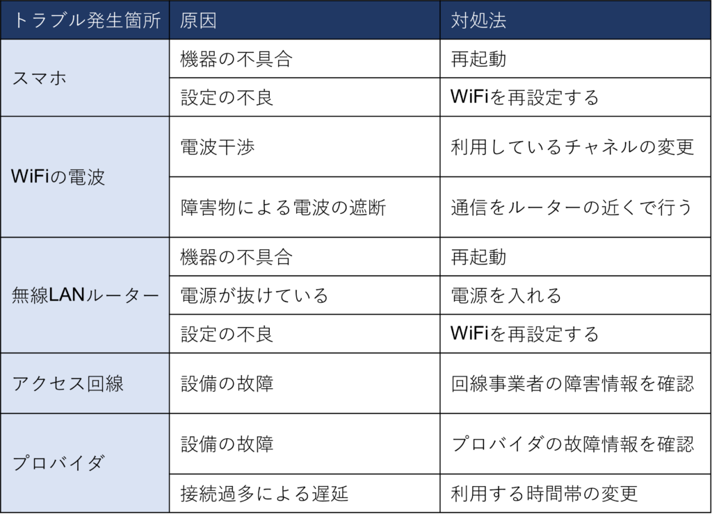 WiFi環境下でスマホがインターネットに繋がらない場合、複数の原因が考えられます。トラブルが発生する箇所ごとに、原因と対処法をまとめました。
