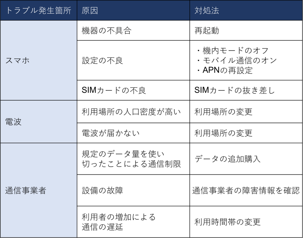 モバイルデータ通信の利用中にスマホがインターネットに繋がらない際の原因と対処法について、以下に示します。